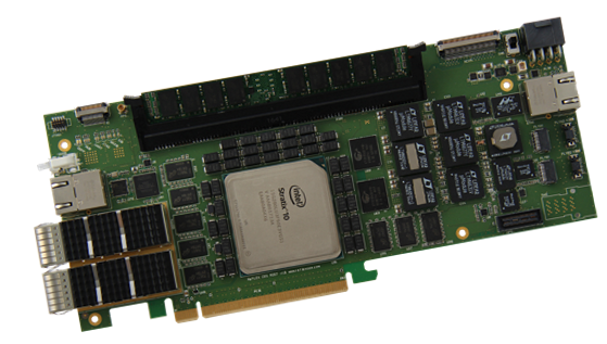 Плата включает один из самый крупных из доступных на данный момент кристаллов Straix10 с объемом 2800 тыс. логических элементов (KLE) для выполнения больших вычислений и различного рода алгоритмов. На плате есть два типа памяти DDR4 и QDR2+, оптический интерфейс 200Гбит через два разъема QSFP28 и выводит данные через PCIe GEN3 Х16. Оптический интерфейс 200Гбит позволяет соединять платы между собой на лету.